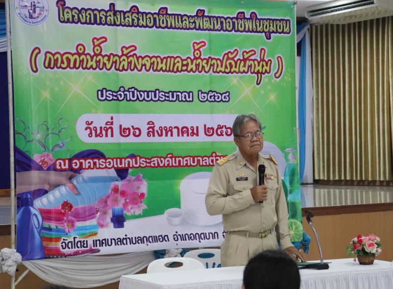 รายละเอียด : วันอังคารที่ 26 สิงหาคม 2568 อำนวยการโดยงานพัฒนาชุมชน สำนักปลัดเทศบาลตำบลกุดแฮด อำเภอกุดบาก จังหวัดสกลนคร ดำเนินการจัดทำโครงการส่งเสริมอาชีพและพัฒนาอาชีพในชุมชน (การทำน้ำยาล้างจานและน้ำยาปรับผ้านุ่ม) ประจำปีงบประมาณ 2568 ณ อาคารอเนกประสงค์เทศบาลตำบลกุดแฮด เพื่อเป็นการส่งเสริมอาชีพและพัฒนาอาชีพในชุมชน โดยมีนายชัยยุทธ วัยเหนิดลื้อ นายกเทศมนตรีตำบลกุดแฮด ให้เกียรติเป็นประธานในพิธี