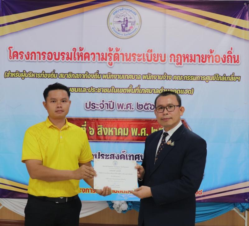 รายละเอียด : วันพุธที่ 6 สิงหาคม 2568 อำนวยการโดยงานนิติการ สำนักปลัดเทศบาลตำบลกุดแฮด จัดทำโครงการให้ความรู้ด้านระเบียบ กฎหมายท้องถิ่น ประจำปี งบประมาณ พ.ศ. 2568 โดยมีวัตถุประสงค์เพื่อให้ความรู้ด้านระเบียบ กฎหมายท้องถิ่น สำหรับผู้บริหารท้องถิ่น สมาชิกสภาท้องถิ่นพนักงานเทศบาล พนักงานจ้าง คณะกรรมการศูนย์ไกล่เกลี่ยข้อพิพาทภาคประชาชน และผู้นำชุมชน ณ อาคารอเนกประสงค์เทศบาลตำบลกุดแฮด โดยมีนายชัยยุทธ วัยเหนิดลื้อ นายกเทศมนตรีตำบลกุดแฮด ให้เกียรติเป็นประธานในพิธี