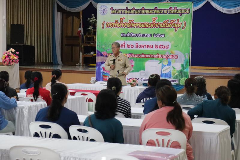 รายละเอียด : วันอังคารที่ 26 สิงหาคม 2568 อำนวยการโดยงานพัฒนาชุมชน สำนักปลัดเทศบาลตำบลกุดแฮด อำเภอกุดบาก จังหวัดสกลนคร ดำเนินการจัดทำโครงการส่งเสริมอาชีพและพัฒนาอาชีพในชุมชน (การทำน้ำยาล้างจานและน้ำยาปรับผ้านุ่ม) ประจำปีงบประมาณ 2568 ณ อาคารอเนกประสงค์เทศบาลตำบลกุดแฮด เพื่อเป็นการส่งเสริมอาชีพและพัฒนาอาชีพในชุมชน โดยมีนายชัยยุทธ วัยเหนิดลื้อ นายกเทศมนตรีตำบลกุดแฮด ให้เกียรติเป็นประธานในพิธี